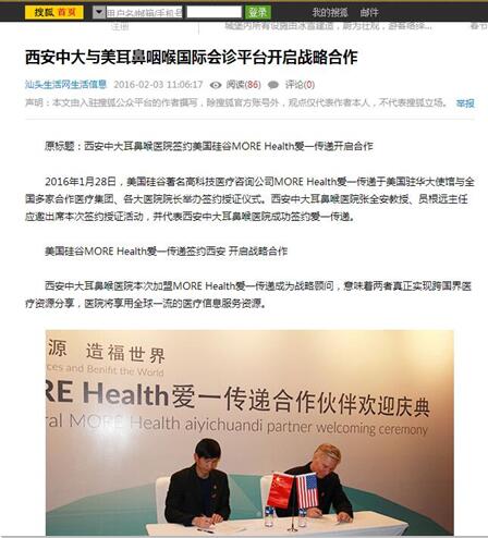 西安新城中大耳鼻喉医院本次加盟MORE Health爱一传递成为战略顾问,意味着两者真正实现跨国界医疗资源分享,医院将享用全球 的医疗信息服务资源。