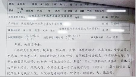 2016年2月13日,小亚东的姐姐翟亚亚因头痛过于厉害,不得已在新年刚过就赶到医院进行检查治疗,被西安新城中大耳鼻喉医院确诊为鼻中隔偏曲、慢性鼻窦炎,需尽快进行手术治疗。
