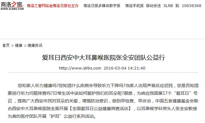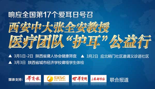 您和家人听力健康吗?您知道什么疾病会导致听力下降吗?当家人出现声音反应迟钝,您是否知道要进行听力问题排查吗?日常生活中该如何爱护我们的耳朵呢?据悉,为响应我国第17个“爱耳日”号召 ,提高广大西安市民对耳朵的关爱,增强防治意识,做到早检查、早诊治,中国五官健康基金会联合西安新城中大耳鼻喉医院全面开展【 爱耳日公益健康筛查活动】,以耳鼻喉学科带头人张全安教授为首的医疗团队开展“护耳”公益行系列活动。